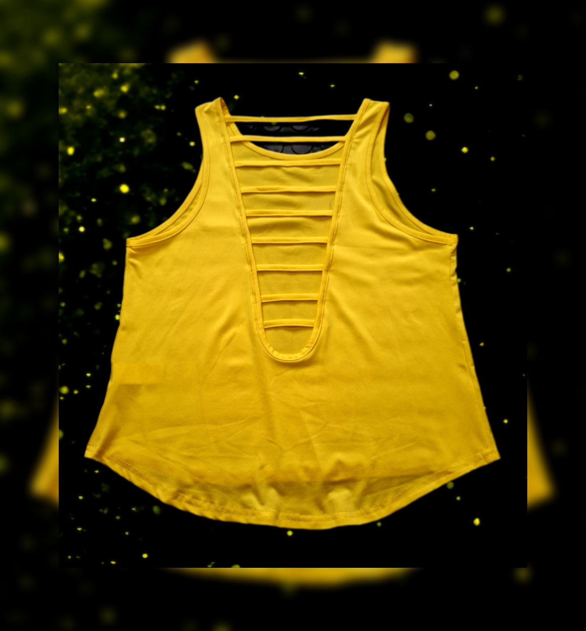 Sunlit Strength - Cut-Out Backless Stand tall and shine bright in Sunlit Strength — a golden expression of resilience and radiance. Inspired by the unwavering sunflower that always turns toward the light, this tank is made for women who rise no matter what.